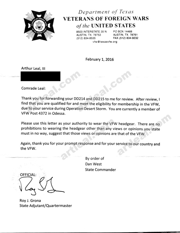 January 14th, 2016 after conducting an interview on KMIDTV regarding PTS, TBI and new open carry law in Texas as a concern to some veterans; open carry supporters, and milbloggers; in "shoot first ask question later" fashion, questioned my service and membership to two of the largest Veteran organizations in the country. The VFW and DAV. As a result, I had to prove my eligibility, again.